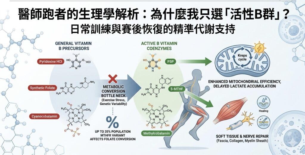 - 酵素轉化受限: 高強度運動引發的氧化壓力與肝腎微循環改變,會降低身體將一般B群轉化為活性輔酶的效率。