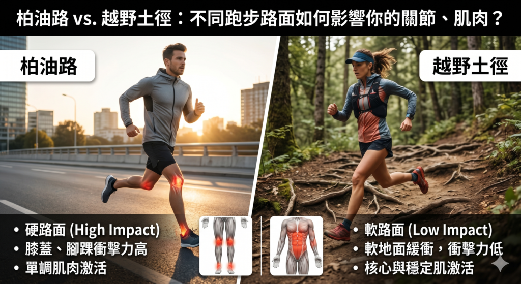 路面類型主要改變的是「受傷的位置」。硬地跑者較易出現過度使用傷害(如跑者膝、應力性骨折);越野跑者則較易面臨急性創傷(如腳踝扭傷)。